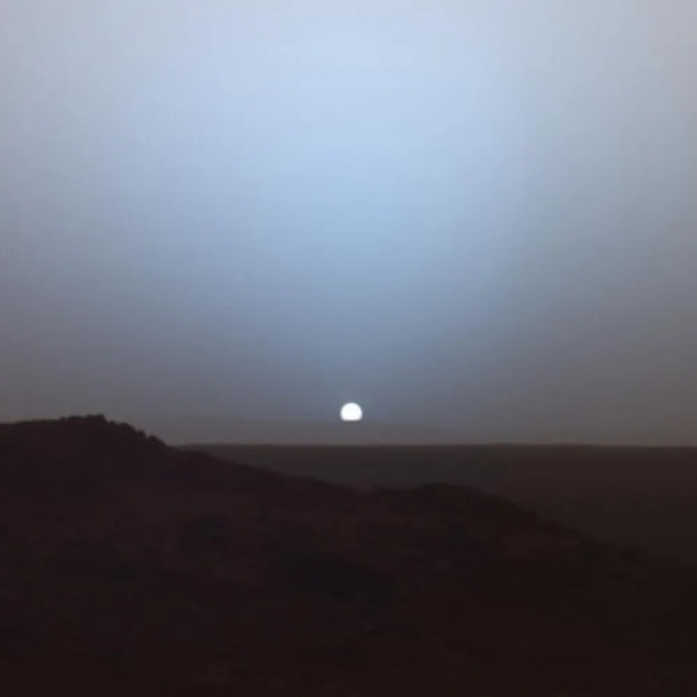 Cette photo de la NASA montre le soleil se couchant sur le terrain rocheux de Mars.