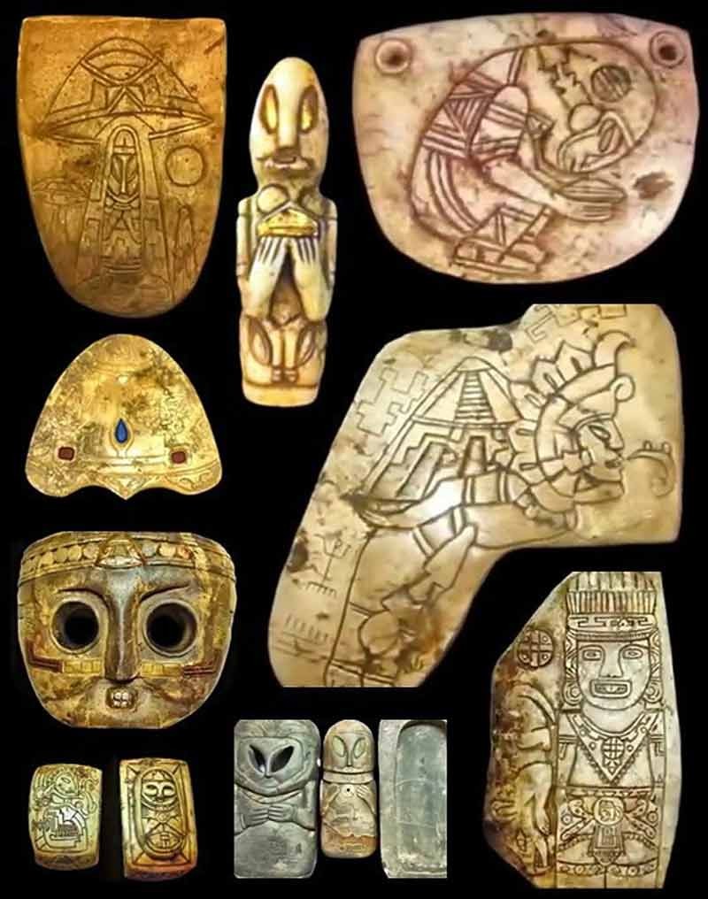Des artefacts mayas en forme de vaisseaux spatiaux et de statues humaines, des extraterrestres et des cartes stellaires. Cependant, ces artefacts ont rapidement été considérés comme un canular. Divers artefacts ont été découverts au fil des ans. La première série d'artefacts (voir l'image ci-dessous) a été découverte à Calakmul, au Mexique. Le site de découverte est situé au milieu sud de la péninsule du Yucatán, dans le sud du Mexique.