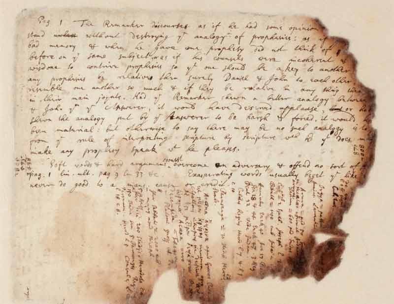 Les notes écrites par Sir Newton ont été endommagées après que Diamond, le chien de chasse de Newton, a sauté une nuit sur la table, renversant une bougie, ce qui a mis le feu aux notes. Heureusement, les lettres sont encore lisibles.
